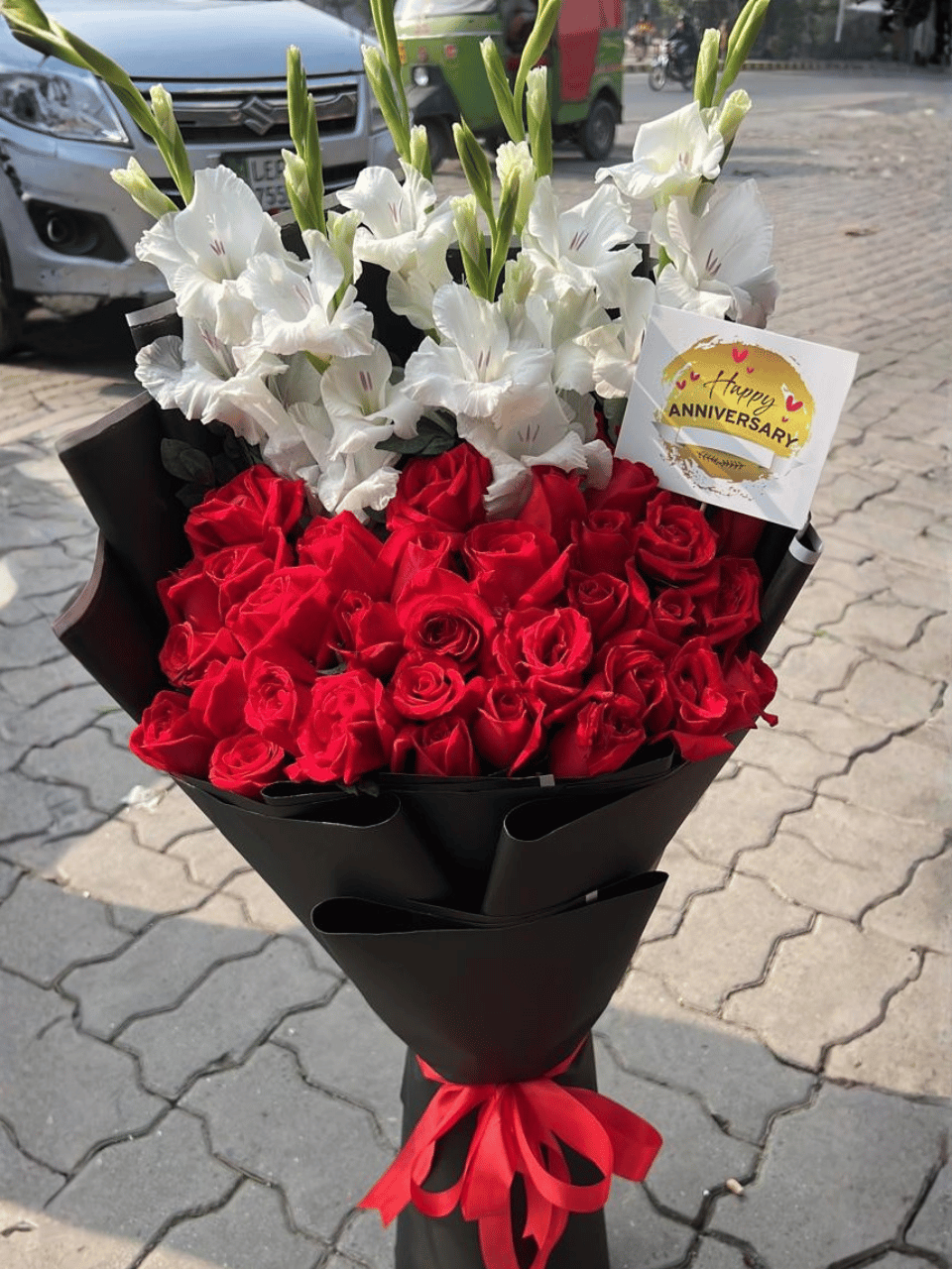 Red Rose Bouquet: A perfectly sized bouquet of approximately two dozen vibrant red roses, symbolizing love and joy. The roses are wrapped in sophisticated matte black paper and secured with a red ribbon.