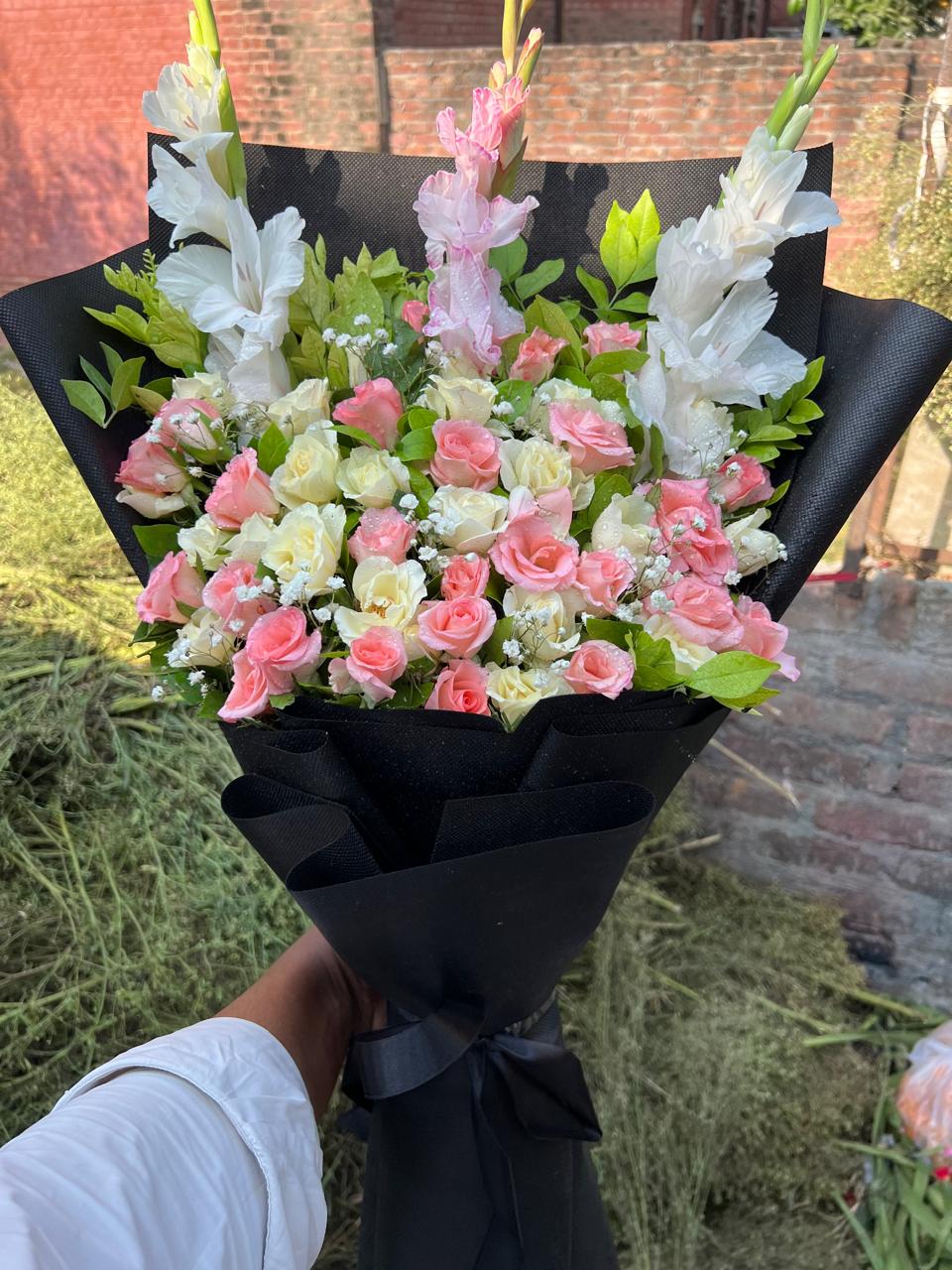 Our “Sweet Delight Bouquet” is designed to convey gentle affection, happiness, and heartfelt admiration. This lush, multi-hued arrangement combines the delicate beauty of pastel roses with the striking height of gladiolus spikes, creating a bouquet that is both soft and impressive. The contrast of the sweet blooms against the dramatic black wrap makes this a perfect gift for celebrating new mothers, birthdays, congratulations, or expressing sympathy with tender care.