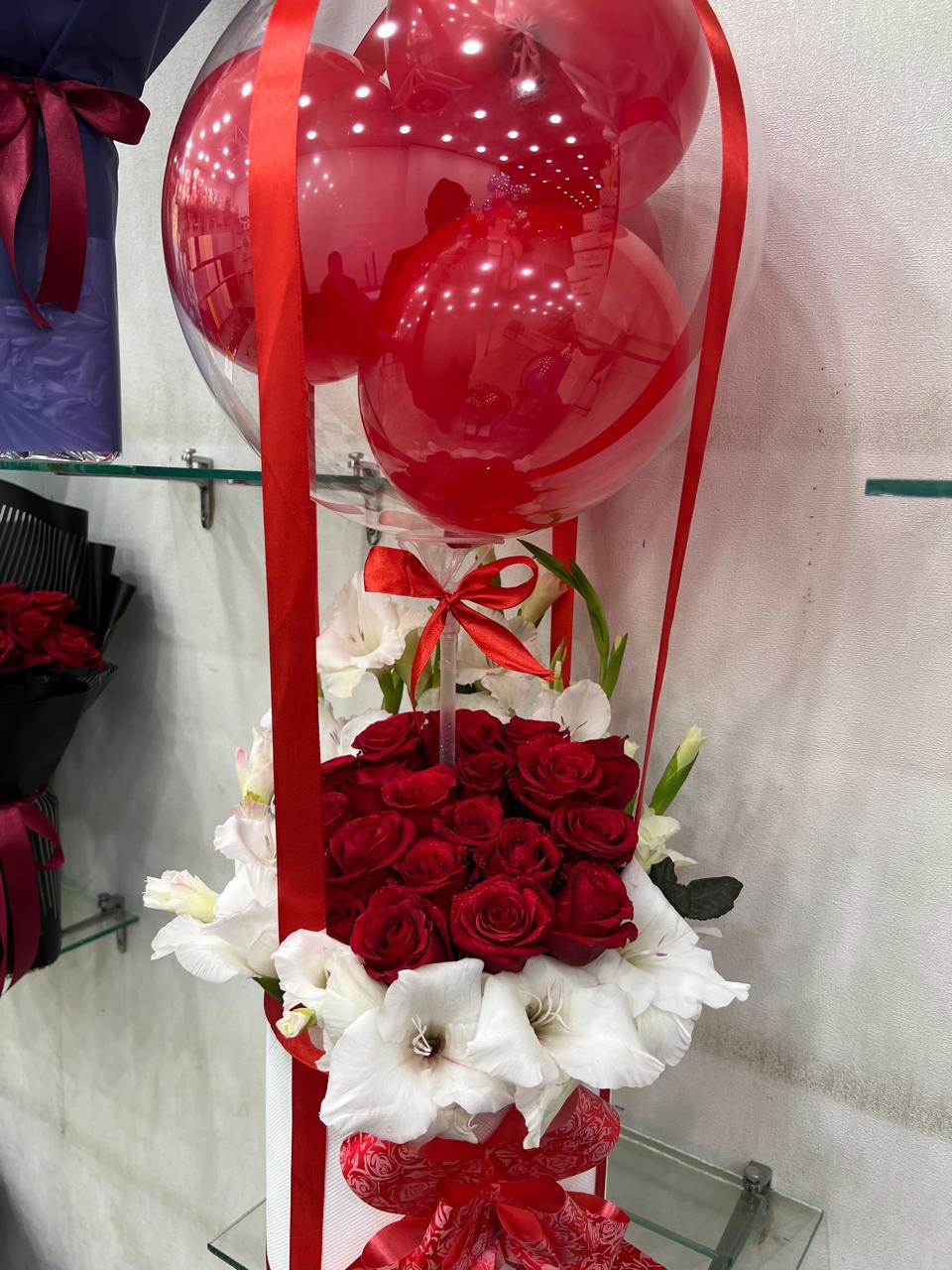 The standout feature of this product is the hot air balloon setup. A clear, transparent bubble balloon sits atop the flowers, housing smaller red balloons inside. Secured with silky red ribbons and a delicate bow, it creates a whimsical and luxurious look that is sure to leave a lasting impression.