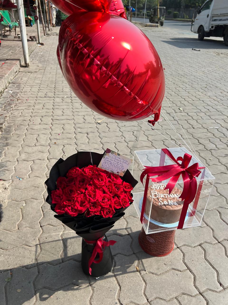 Giant Red Foil Balloon: A large, striking red foil balloon, adding height, glamour, and a festive atmosphere to the entire gift. The balloon comes inflated and tied with ribbons.
