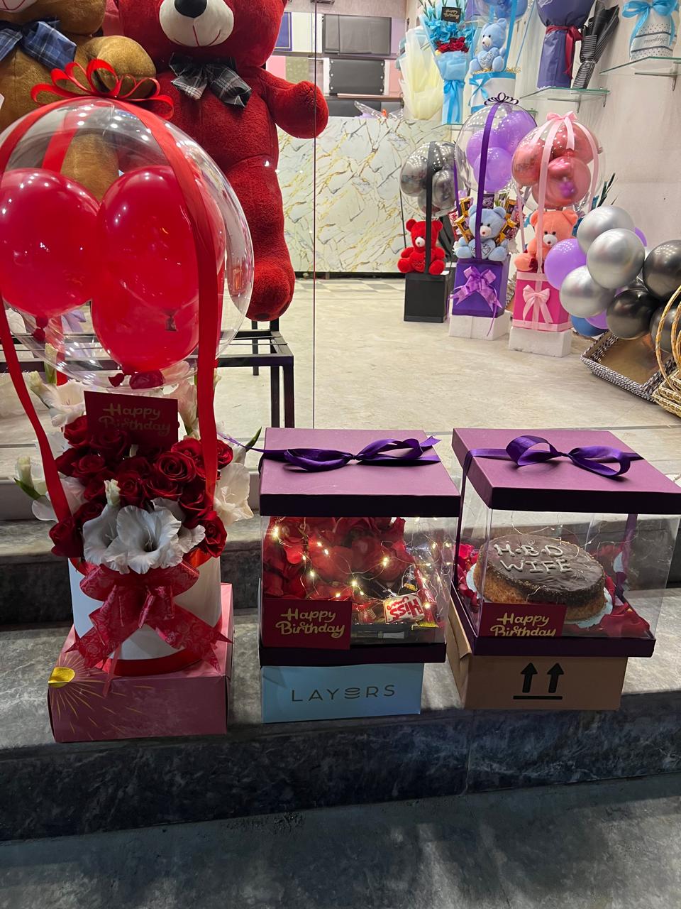 Make her feel truly special with this ultimate birthday bundle featuring a stunning red rose hot air balloon arrangement, a chocolate “HBD WIFE” cake, and a box of fresh roses with fairy lights. A complete, ready-to-gift celebration set for your loved one in Lahore.