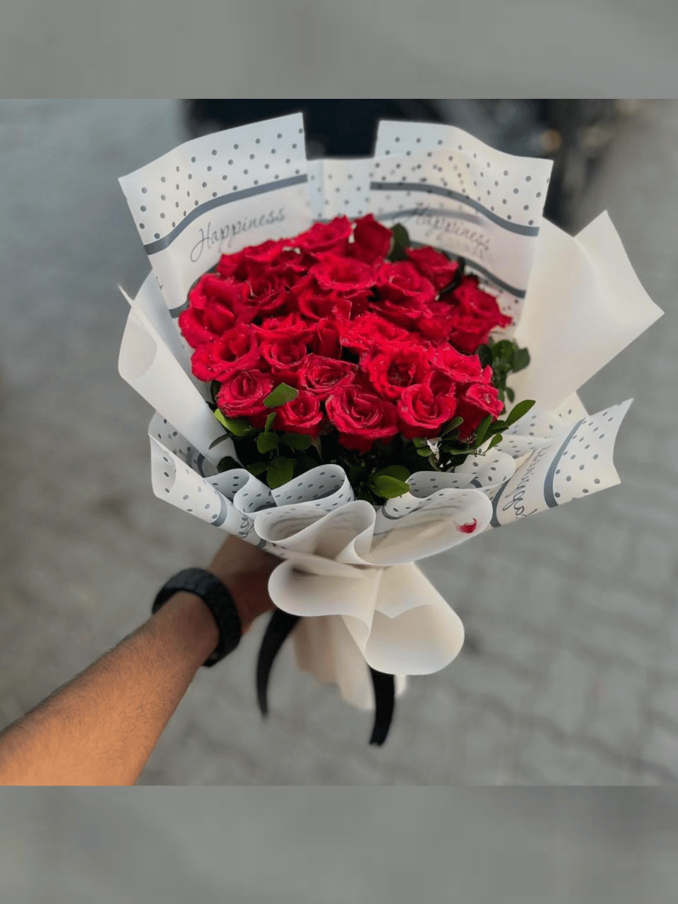 Wrapping: Wrapped in high-quality, white paper with an elegant grey polka-dot pattern. The wrapping also includes subtle script text like “Happiness,” adding a thoughtful, decorative touch.