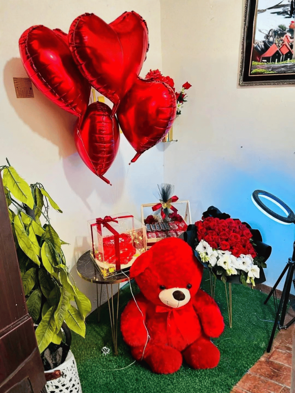 1. Massive Red Teddy Bear: A centerpiece Giant Red Teddy Bear, guaranteed to be a huggable, permanent keepsake and a focal point of the room.