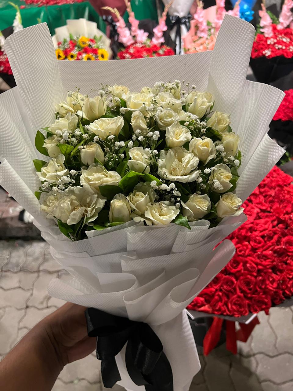 • Dominant Flower: Approximately 25-30 pristine white roses, displayed in various stages of bloom for depth and texture.
